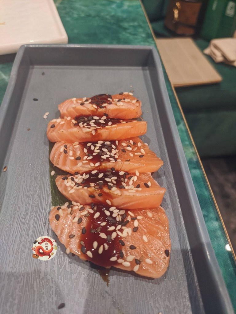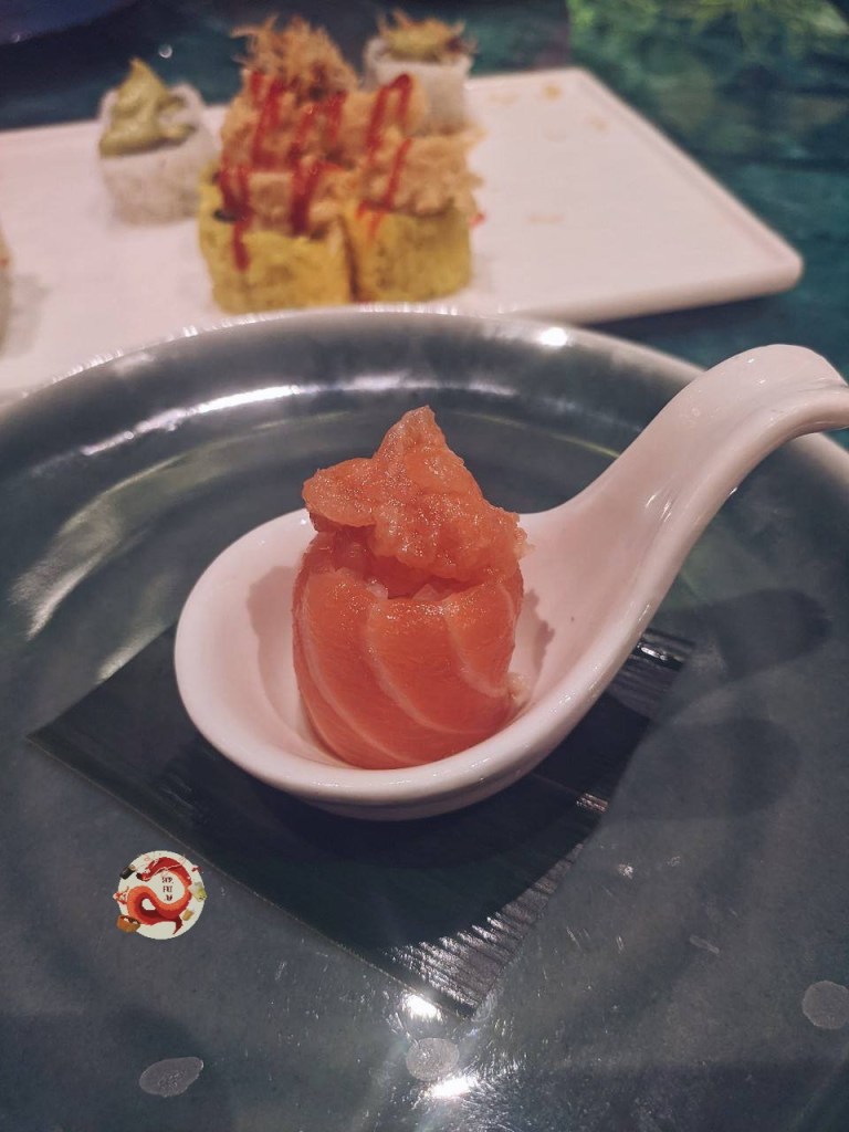 Se siete amanti del salmone non perdetevi la loro tartare con una salsina alle carote, leggermente piccante e il bignè ponzu (bignè di riso avvolto da salmone e ricoperto con tartare di salmone in