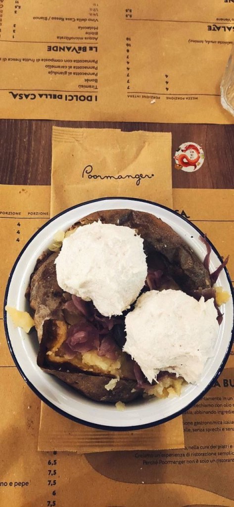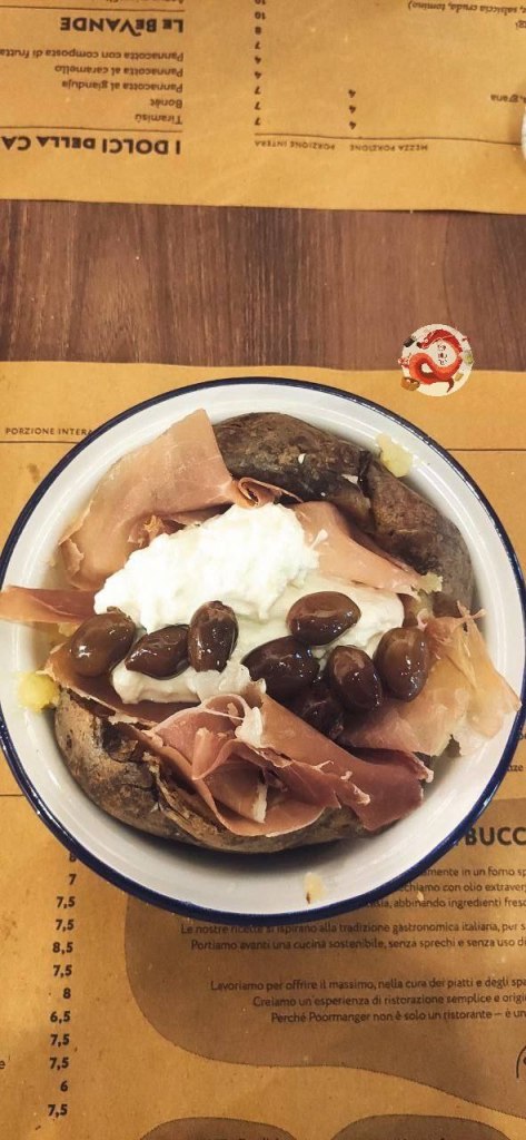 Torniamo al cibo , anzi alla patata! Quelle servite qui sono da circa 400 grammi, con una polpa bella farinosa e a pasta gialla. Vengono cotte in un forno speciale, a gas, e poi mantecate con olio evo ligure. Alla fine si avrà una patata morbida e ben condita con una buccia super croccante da mangiare!